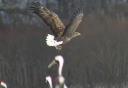 | オオワシ | 国内希少野生動植物種・天然記念物 日本で見られる猛禽類では最大の大きさ 流氷と共に日本にやって来るようです。 オホーツク海では流氷の上で休むオオワシを多く見られます。 警戒心が強くタンチョウの居ると事へはめったに 降りて来ません。 オジロワシの上で餌を求めて旋回していてオジロワシが 取って来た餌を上空で横取りします。 |