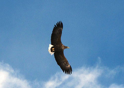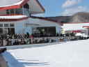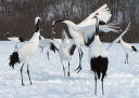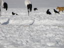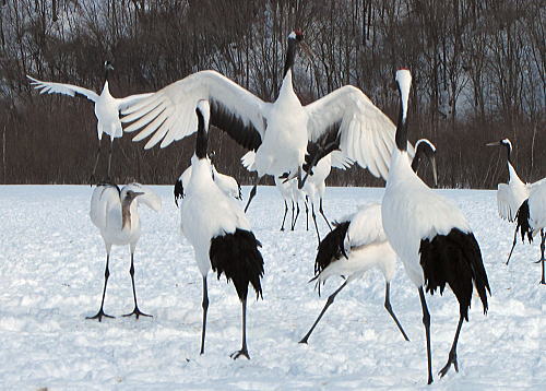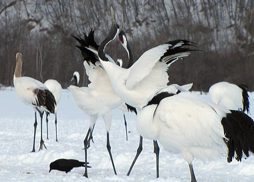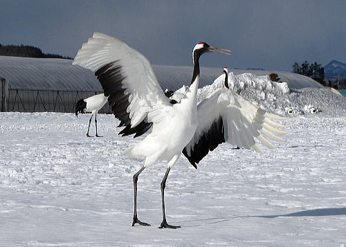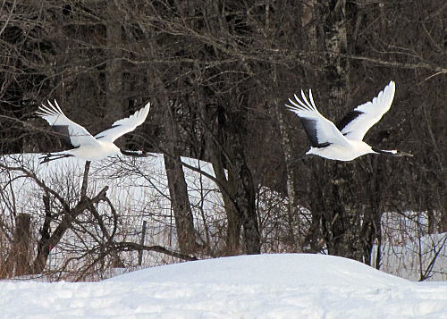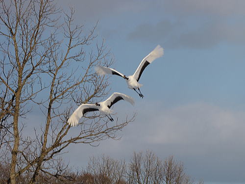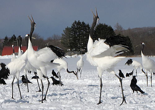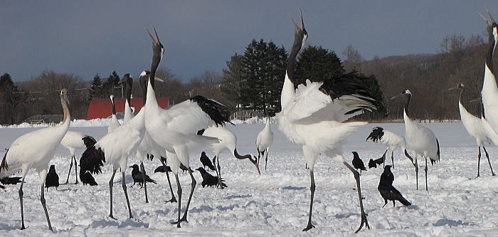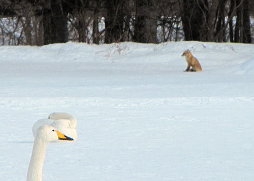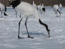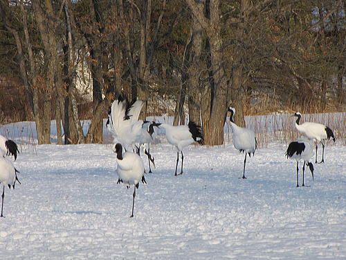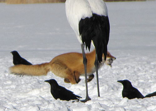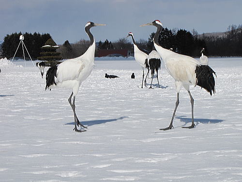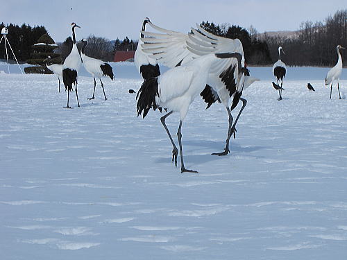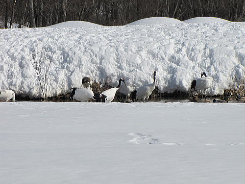 12:40 阿寒国際ツルセンター到着 空港より車で約20分の道のりです。 阿寒の今朝の気温は−22℃だったそうです。(阿寒国際ツルセンターブログより) 本館から別館のタンチョウがたくさん居るところへは本館前のビオトープ(池などがある)から 別館へタンチョウを見ながら行けるようになってるのです。 パパが写真を撮ってるところが下にありますが、その先の人ごみが別館です。 ここで朝はデントコーン、14時は活きたウグイを撒きます。 それを目当てにプロ・アマの写真家がたくさん訪れるのです。 そこへの道のりは近いのですが、下はアイスバーンになっていて端を通らなければ かなり滑ります。 ベタ足で転ばないように上手に歩いていたのですが、その人・人・人を見た途端、 かなりあせりました。 そしてアイスバーンだという事をすっかり忘れた私は知らない間に真ん中に行ってしまい、 スッテーン!そうです。転んだのです。 凍ってるのでそれはそれは物凄く痛かったぁ〜(^^ゞ まぁ〜その痛みも綺麗なタンチョウを見たらすっかり忘れましたがね(苦笑) お魚タイムまで1時間以上あります。 タンチョウはみんなそれぞれダンスをしたり飛び跳ねたり楽しんでるようです。 お魚タイム(活きたウグイ)が近づいてきた10分くらい前からキタキツネはちゃんとお行儀よく お座りして待ってます。 お魚を撒く人もだいたい同じ人なのでその人が出て来るとオオワシやオジロワシも 木の上で待機してたのが突然上空を旋回! 動物って時間がほんと良く判りますよねぇ〜! いよいよお魚の奪い合いが始まります。 オジロワシは上空からお魚を狙って急降下しキャッチしに来るのですが、 それに怒ったタンチョウがキック! 上手い具合にオジロワシが足で掴んで上空に行けば、今度は更に上空に居る オオワシがオジロワシの魚を横取り。 オオワシは神経質というか用心深いのでタンチョウの居る所へはほとんど降りて来ません。 オジロワシが取ったものを横取りして奪うのです。 ここにタンチョウの鳴き合いの動画があります。 |